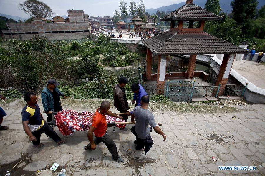 People carry the body of a victim in Bhaktapur, Nepal, April 26, 2015. A total of 3,218 people were killed and about 6,500 others injured in the powerful earthquake that struck Nepal on Saturday, the authorities said April 27. (Xinhua/Pratap Thapa)