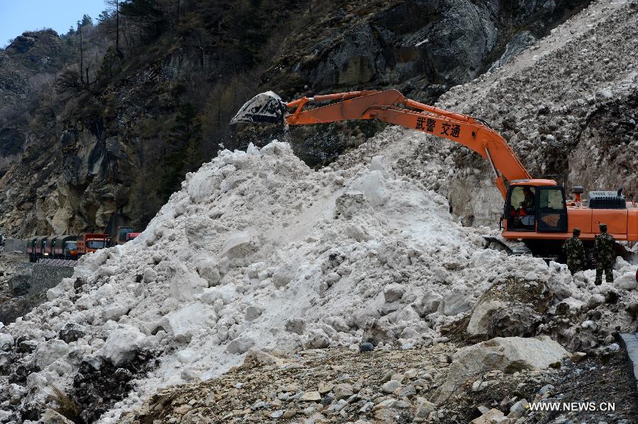 A navvy of armed traffic police repairs a snowslide affected road to quake-hit Jilung County in Xigaze City, southwest China's Tibet Autonomous Region, April 27, 2015. A 8.1-magnitude quake shook Nepal at 2:11 p.m. (Beijing Time) on Saturday, killing at least 3,218 people. The quake also strongly affected parts of Tibet, adjacent to Nepal. (Xinhua/Chen Tianhu)