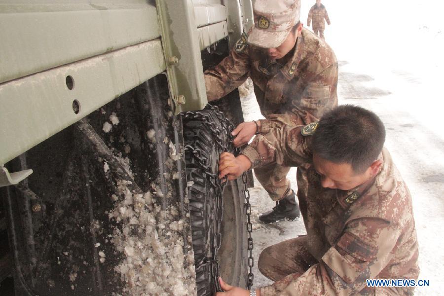 Soldiers mount tyre chains on a heavy truck carrying relief materials in southwest China's Tibet Autonomous Region, April 26, 2015. China is mobilizing all kinds of resources from rescue teams to relief supplies to the earthquake-hit Tibet Autonomous Region and the neighboring Nepal on the other side of the world's highest mountain. (Xinhua/Li Yuanhua)