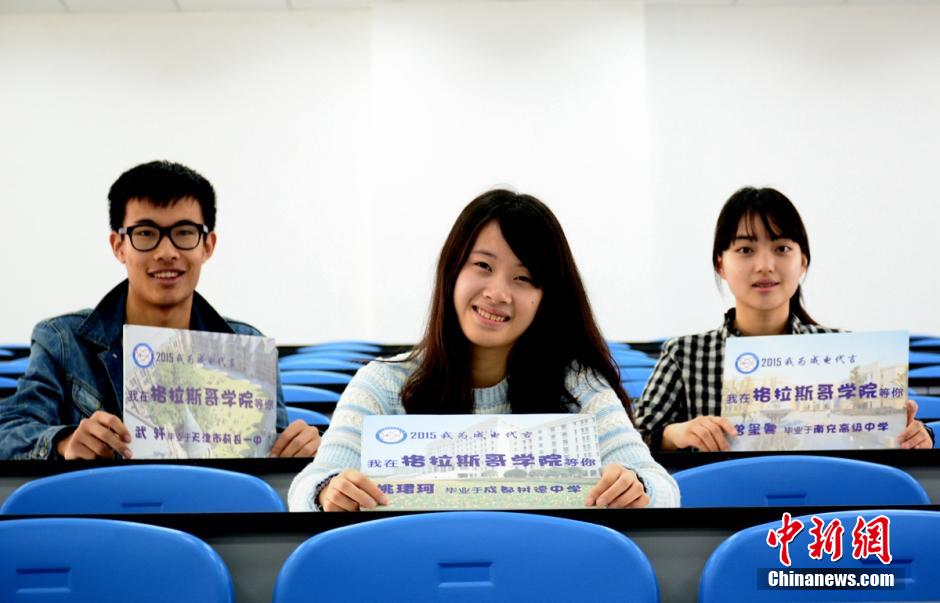 Students of UoG-UESTC Joint School (A four year undergraduate program jointly offered by the University of Glasgow and the University of Electronic Science & Technology of China) took stylish enrolment advertising photos in the alameda, teaching building, playground and dormitory of the school in late April 2015. Students held signs with words like “I am waiting for you in UoG-UESTC Joint School”. (Chinanews/Zhong Xin)