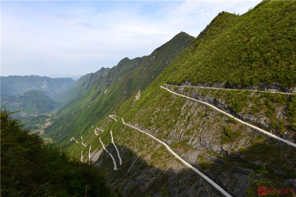 In the mountains of west Hubei province, there is a steep mountain road dug up by the locals. People call the road a “sky road” as it hangs above the mountain if they look at it from afar. (Xinhua/Song Wen)