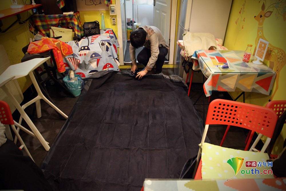 To save rent, the young couple sleep on an inflatable mattress, yet they still cherish every bit of the "hardship" they are experiencing right now.(China Youth Daily/Meng Chang)