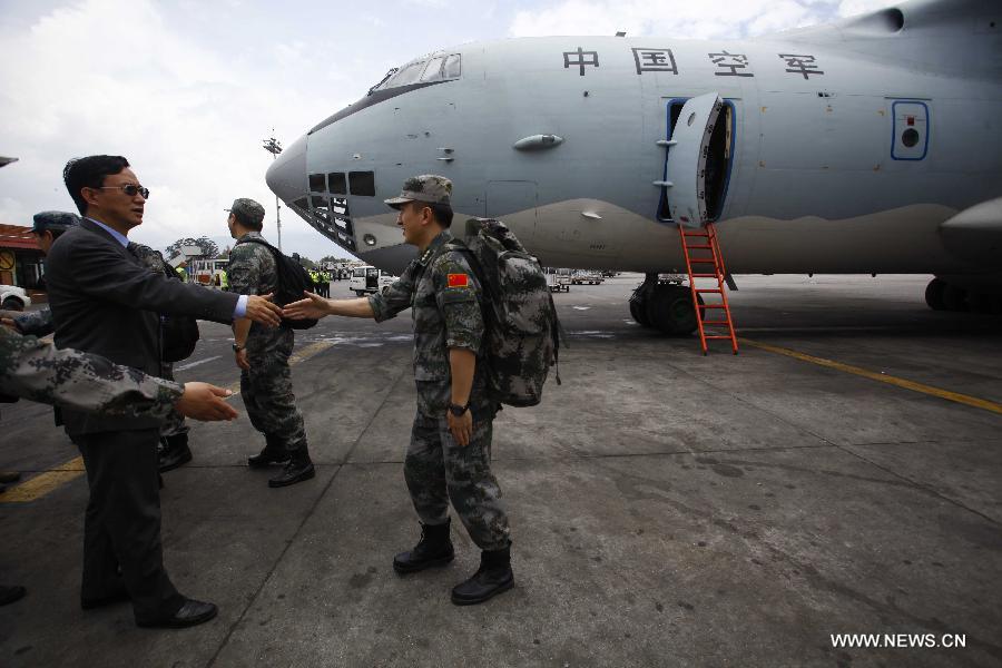 Chinese Ambassador to Nepal Wu Chuntai (L, front) welcomes members of Chinese People's Liberation Army at Tribhuvan International Airport in Kathmandu, Nepal, April 28, 2015. (Xinhua/Pratap Thapa)