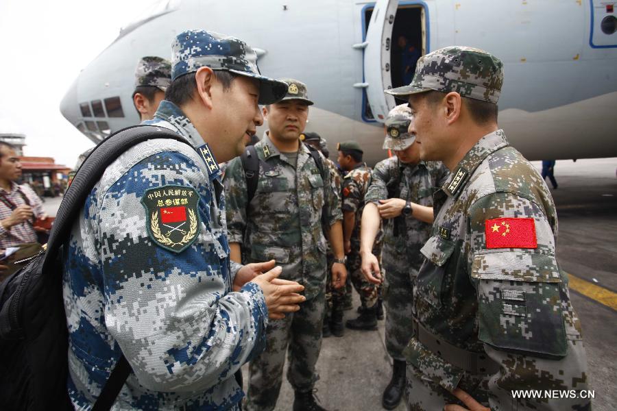 Members of Chinese People's Liberation Army Air Force arrive in Nepal to provide aid following Saturday's earthquake at Tribhuvan International Airport in Kathmandu, Nepal, April 28, 2015. (Xinhua/Pratap Thapa)