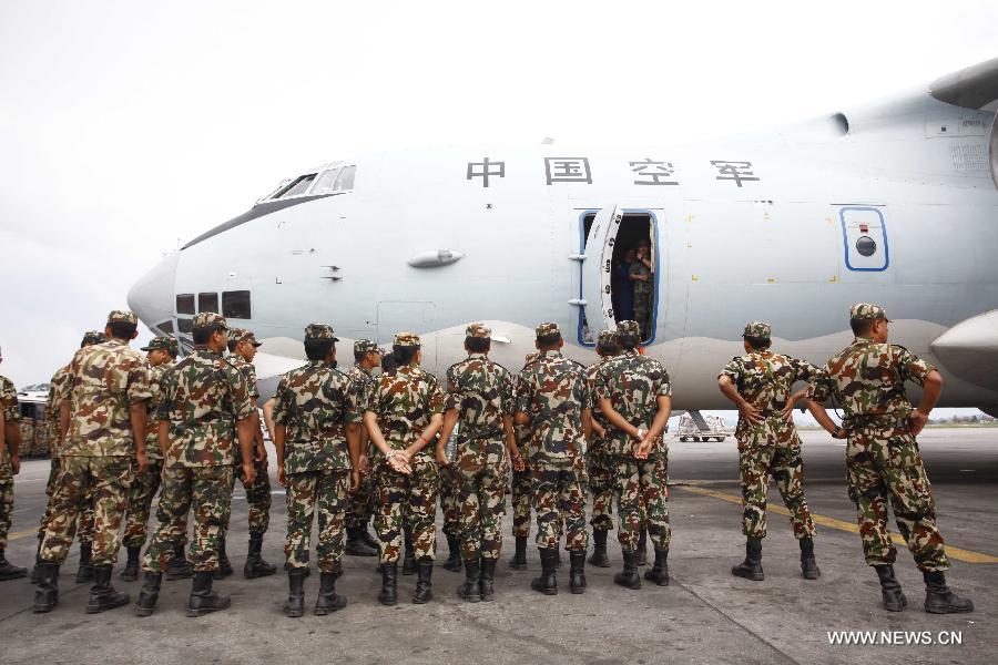 Nepalese army soldiers wait to arrange relief materials from China after Saturday's earthquake at Tribhuvan International Airport in Kathmandu, Nepal, April 28, 2015. (Xinhua/Pratap Thapa)