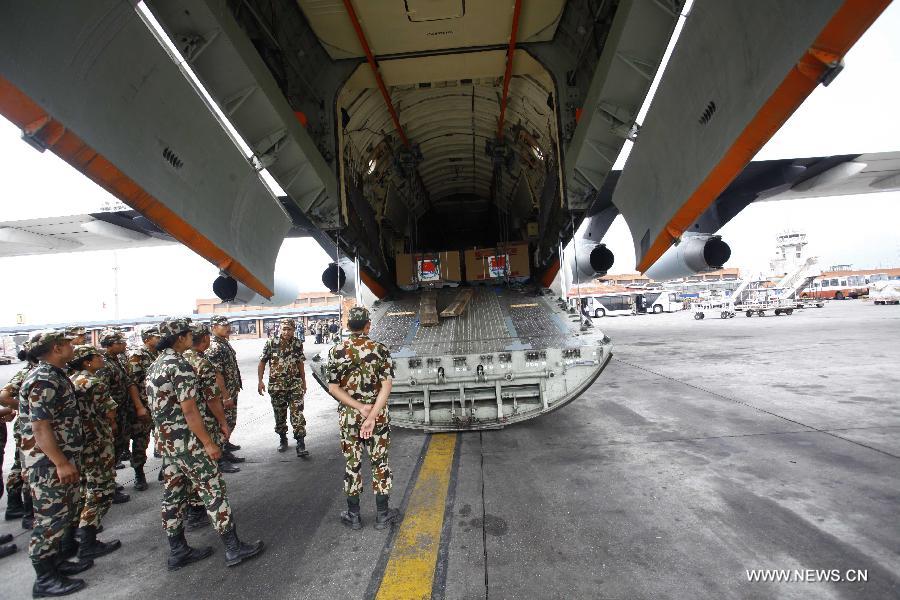 | Nepalese army soldiers wait to arrange rescue materials from China after Saturday's earthquake at Tribhuvan International Airport in Kathmandu, Nepal, April 28, 2015. (Xinhua/Pratap Thapa) |