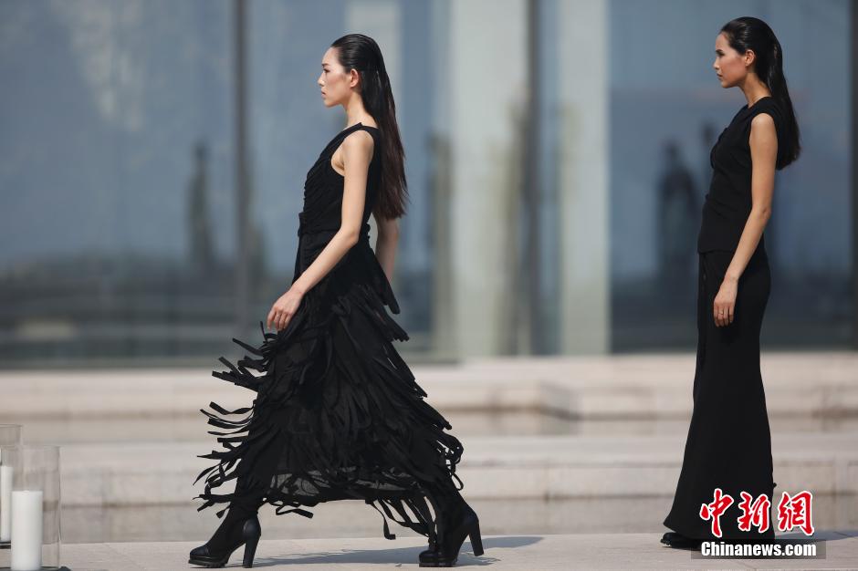 Models present creations of Taiwan designer Gioia Pan in an outdoor show of the 2015 Qingdao Fashion Week on April 26, 2015. (Chinanews/Sheng Jiapeng)