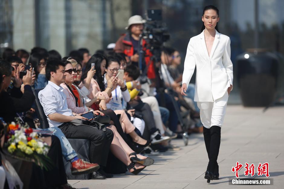 Models present creations of Taiwan designer Gioia Pan in an outdoor show of the 2015 Qingdao Fashion Week on April 26, 2015. (Chinanews/Sheng Jiapeng)