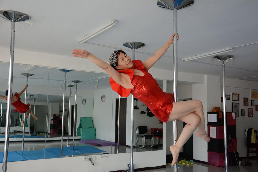 Two years ago, influenced by her daughter who is a pole dancing instructor, 65-year-old Jiang Zhijun started to learn pole dancing. Now she can even perform some difficult movements.