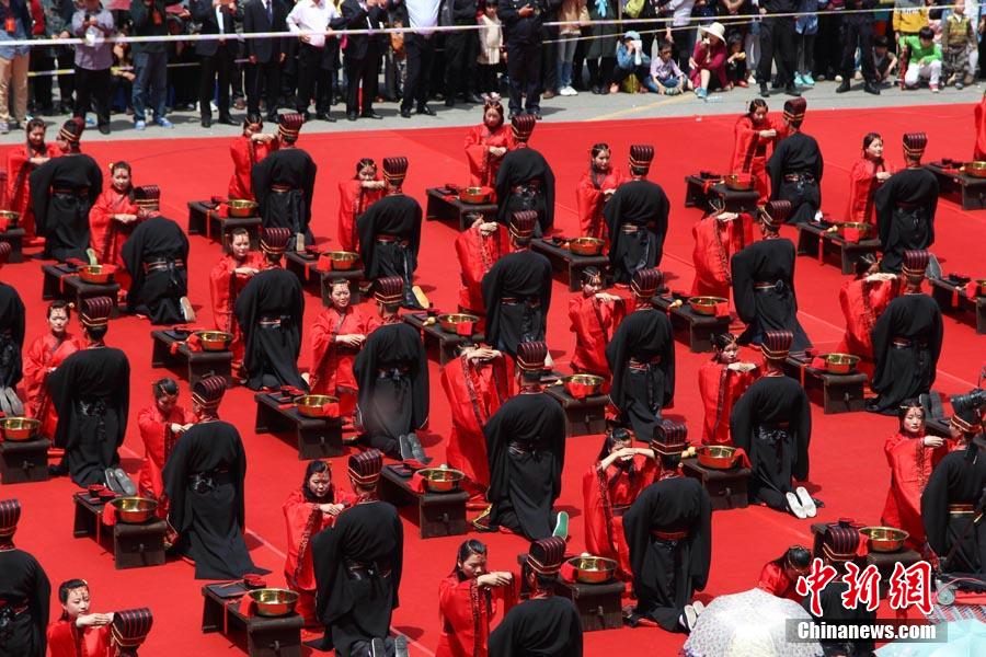 About 100 couples hold a Han-style group wedding at Laojunshan Mountain, central China's Henan province, April 26, 2015. Located in Luanchuan county, Laojunshan Mountain is famous for its rich Taoist culture and wonderful scenery. (CNS/Cao Fuchuan)