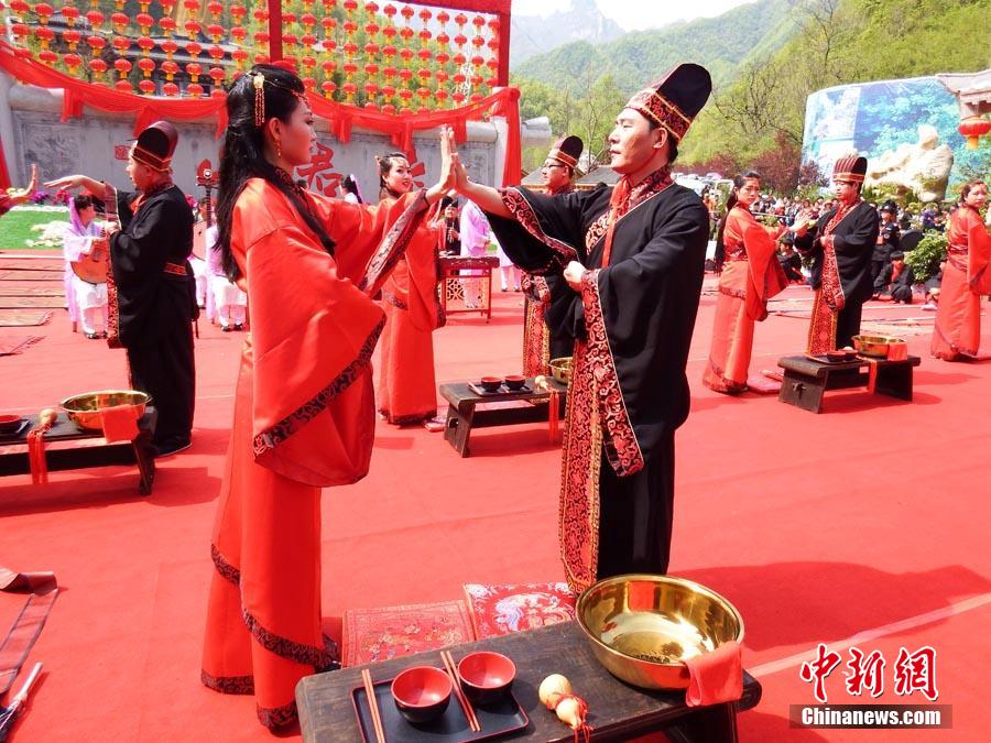 About 100 couples hold a Han-style group wedding at Laojunshan Mountain, central China's Henan province, April 26, 2015. Located in Luanchuan county, Laojunshan Mountain is famous for its rich Taoist culture and wonderful scenery. (CNS/Cao Fuchuan)