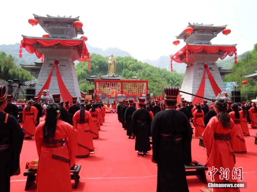 About 100 couples hold a Han-style group wedding at Laojunshan Mountain, central China's Henan province, April 26, 2015. Located in Luanchuan county, Laojunshan Mountain is famous for its rich Taoist culture and wonderful scenery. (CNS/Cao Fuchuan)