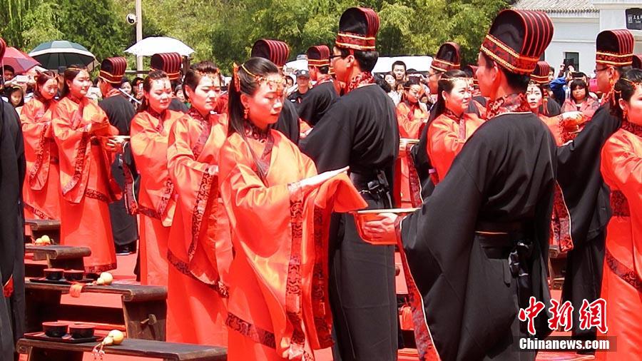 About 100 couples hold a Han-style group wedding at Laojunshan Mountain, central China's Henan province, April 26, 2015. Located in Luanchuan county, Laojunshan Mountain is famous for its rich Taoist culture and wonderful scenery. (CNS/Cao Fuchuan)