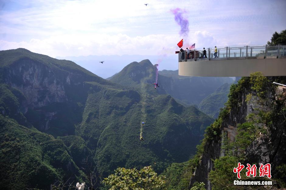 On April 26, 2015, the world's top wingsuit enthusiast Miles and China's No.1 wingsuit enthusiast Xu Kai perform low-altitude parachuting at the world's longest cantilever bridge in the Longgang Scenic Zone of Yunyang county, southwest China’s Chongqing. The bridge was officially opened to the public on the day. (CNS Photo)