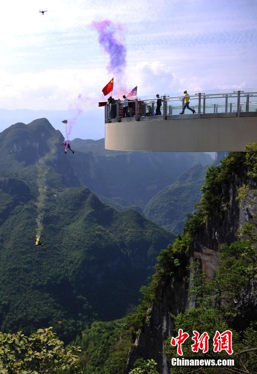 | On April 26, 2015, the world's top wingsuit enthusiast Miles and China's No.1 wingsuit enthusiast Xu Kai perform low-altitude parachuting at the world's longest cantilever bridge in the Longgang Scenic Zone of Yunyang county, southwest China’s Chongqing. The bridge was officially opened to the public on the day. (CNS Photo) |
