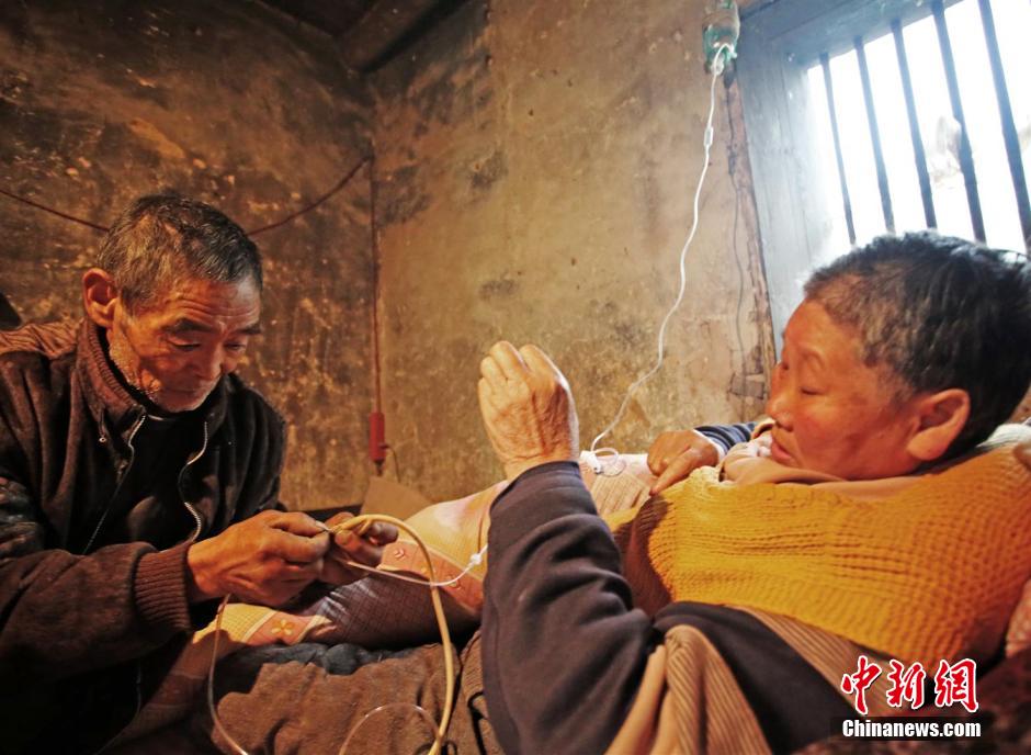 Fu Chengquan learns to give her wife injection and transfusion. He does this for his wife every day. (CNS/Li Feng)