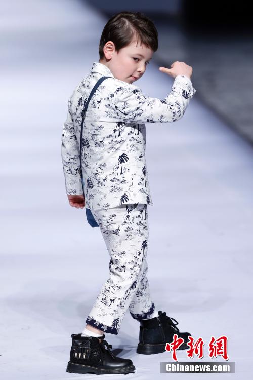 The cute child models present the clothes designed by Gui Long, a well-known fashion design house in Qingdao, east China's Shandong Province on April 26, 2015. At the 2015 Qingdao Fashion Week, Gui Long launched British-style clothing for children. (Chinanews.com/Sheng Jiapeng)