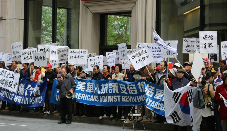 Hundreds protest in front of Japanese Consulate in San Francisco urging Japanese government to apologize for its war crimes on April 28, 2015. (People's Daily Online/Han Shasha)