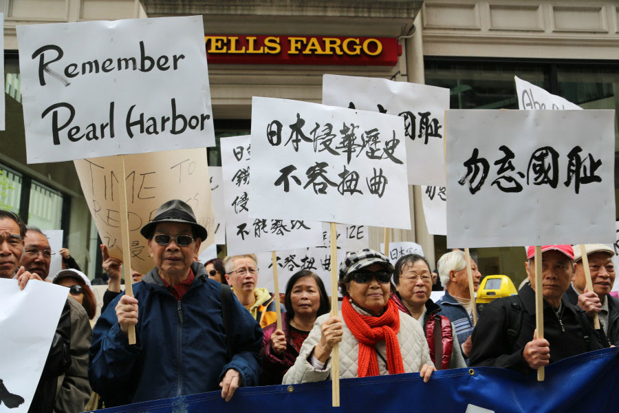 | Hundreds protest in front of Japanese Consulate in San Francisco urging Japanese government to apologize for its war crimes on April 28, 2015. (People's Daily Online/Han Shasha) |