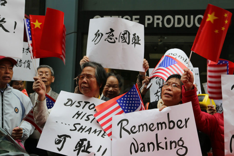 With Chinese and South Korean flags as well as signs in hands, protesters chanted "Shame on Abe" and "Abe apologizes" both in Chinese and English.