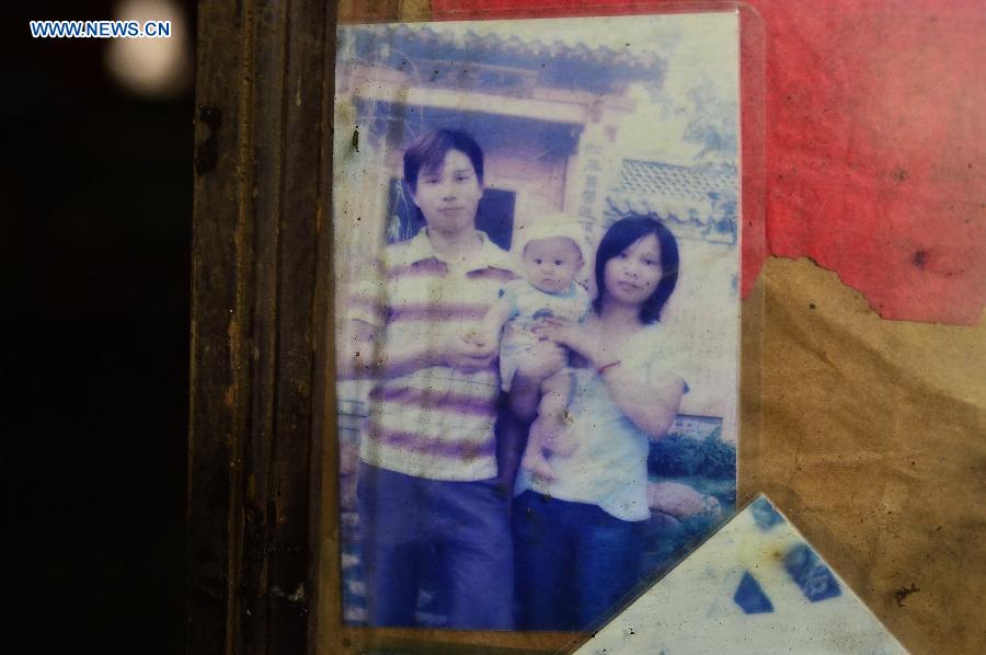 Photo taken on April 28, 2015 shows an old family photo of Xu Yuelian and her husband Yang Zubin at their house in Jishui County, east China's Jiangxi Province. Yang Zubin and Xu Yuelian, both 34 years old, are a couple in Nanpo Village of Huangqiao Township in Jishui County of Jiangxi Province. Yang survived a severe traffic accident and ended up in vegetative state in 2012. Though being beset by perils, Xu didn't give up on her husband and her family. With Xu's utmost care, Yang opened his eyes and regained some of his consciousness in 2014, which is rare in such circumstances. The couple who have shared weal and woe are still hoping for miracles to happen. (Xinhua/Zhou Mi)