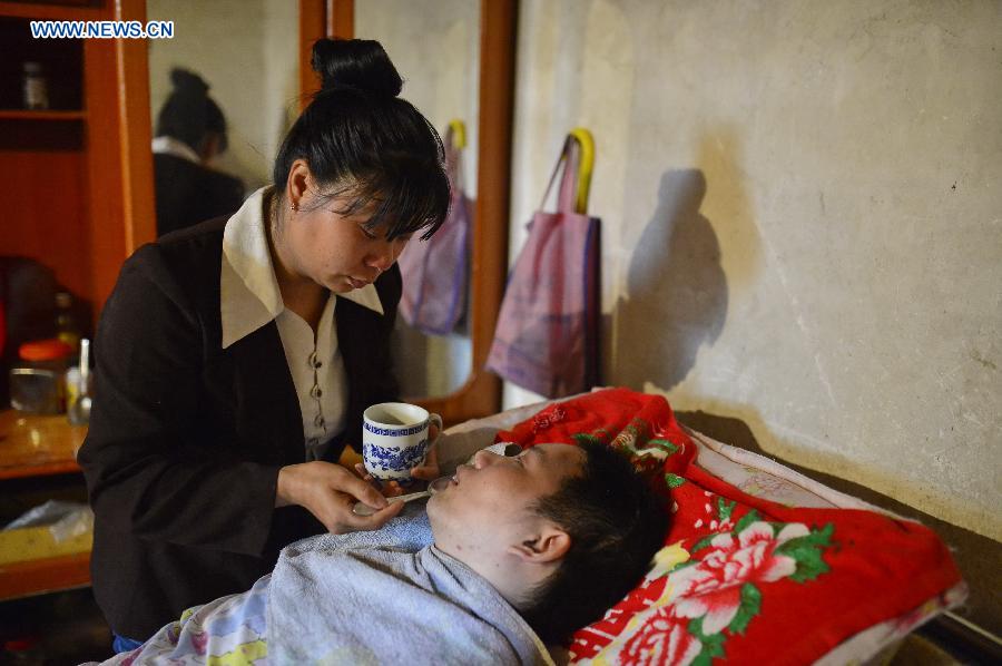 Photo taken on April 28, 2015 shows Xu Yuelian feeds her vegetative husband Yang Zubin brown sugar water at their house in Jishui County, east China's Jiangxi Province. Yang Zubin and Xu Yuelian, both 34 years old, are a couple in Nanpo Village of Huangqiao Township in Jishui County of Jiangxi Province. Yang survived a severe traffic accident and ended up in vegetative state in 2012. Though being beset by perils, Xu didn't give up on her husband and her family. With Xu's utmost care, Yang opened his eyes and regained some of his consciousness in 2014, which is rare in such circumstances. The couple who have shared weal and woe are still hoping for miracles to happen. (Xinhua/Zhou Mi)