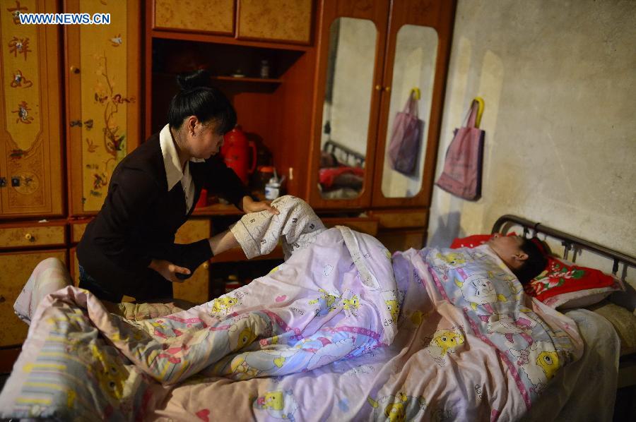 Photo taken on April 28, 2015 shows Xu Yuelian moves legs of her vegetative husband Yang Zubin at their house in Jishui County, east China's Jiangxi Province. Yang Zubin and Xu Yuelian, both 34 years old, are a couple in Nanpo Village of Huangqiao Township in Jishui County of Jiangxi Province. Yang survived a severe traffic accident and ended up in vegetative state in 2012. Though being beset by perils, Xu didn't give up on her husband and her family. With Xu's utmost care, Yang opened his eyes and regained some of his consciousness in 2014, which is rare in such circumstances. The couple who have shared weal and woe are still hoping for miracles to happen. (Xinhua/Zhou Mi)