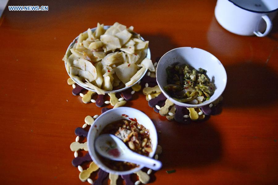 Photo taken on April 28, 2015 shows pickled bean curd and brined vegetables Xu Yuelian eats as dishes everyday at her house in Jishui County, east China's Jiangxi Province. Yang Zubin and Xu Yuelian, both 34 years old, are a couple in Nanpo Village of Huangqiao Township in Jishui County of Jiangxi Province. Yang survived a severe traffic accident and ended up in vegetative state in 2012. Though being beset by perils, Xu didn't give up on her husband and her family. With Xu's utmost care, Yang opened his eyes and regained some of his consciousness in 2014, which is rare in such circumstances. The couple who have shared weal and woe are still hoping for miracles to happen. (Xinhua/Zhou Mi)