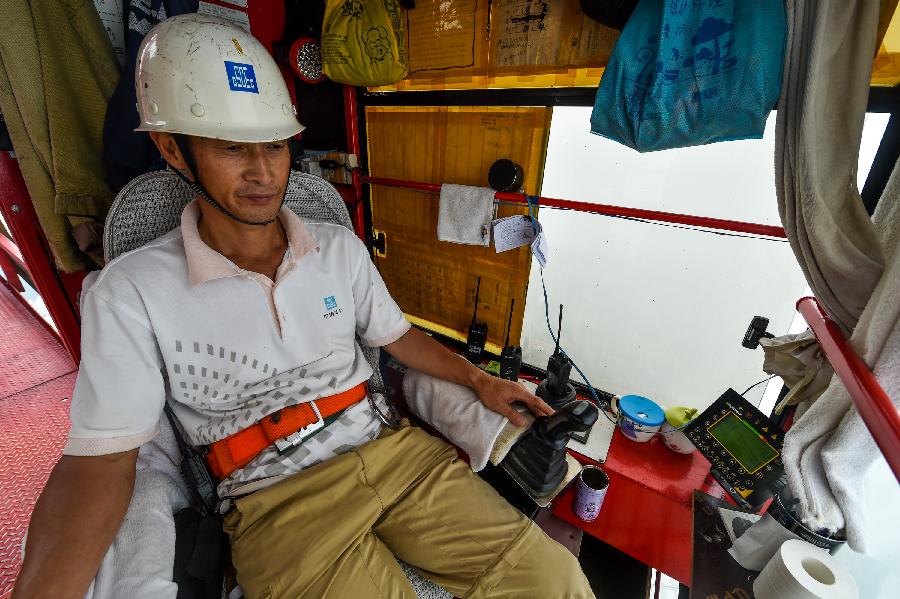 | Photo taken on April 18, 2015 shows Wang Hua, a tower crane operator, works at a small operating room on a tower crane in Shenzhen, south China's Guangdong Province. Wang Hua, a 50-year-old from central China's Henan Province, is a good hand in operating tower crane. Though he used to be a security guard when he was young, he quickly grew into an excellent tower crane operator due to his diligence and love of learning. He was engaged in many larger construction projects like the new site of CCTV and the Water Cube, and the current project he is working in is the Pingan International Financial Center in Shenzhen. It's dangerous and lonely to work on a tower crane to a height of a few hundred meters, but Wang Hua has no thought of retiring yet, not until he would build a higher building after the Pingan International Financial Center. (Xinhua/Mao Siqian) |