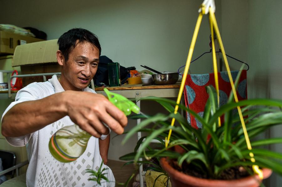 | Photo taken on April 20, 2015 shows Wang Hua, a tower crane operator, sprays water onto his bracketplant at his dorm in Shenzhen, south China's Guangdong Province. Wang Hua, a 50-year-old from central China's Henan Province, is a good hand in operating tower crane. Though he used to be a security guard when he was young, he quickly grew into an excellent tower crane operator due to his diligence and love of learning. He was engaged in many larger construction projects like the new site of CCTV and the Water Cube, and the current project he is working in is the Pingan International Financial Center in Shenzhen. It's dangerous and lonely to work on a tower crane to a height of a few hundred meters, but Wang Hua has no thought of retiring yet, not until he would build a higher building after the Pingan International Financial Center. (Xinhua/Mao Siqian) |