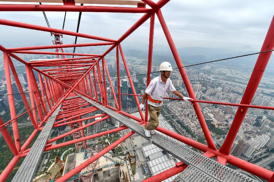 | Photo taken on April 21, 2015 shows Wang Hua, a tower crane operator, examines the jib of a tower crane up in the air in Shenzhen, south China's Guangdong Province. Wang Hua, a 50-year-old from central China's Henan Province, is a good hand in operating tower crane. Though he used to be a security guard when he was young, he quickly grew into an excellent tower crane operator due to his diligence and love of learning. He was engaged in many larger construction projects like the new site of CCTV and the Water Cube, and the current project he is working in is the Pingan International Financial Center in Shenzhen. It's dangerous and lonely to work on a tower crane to a height of a few hundred meters, but Wang Hua has no thought of retiring yet, not until he would build a higher building after the Pingan International Financial Center. (Xinhua/Mao Siqian) |