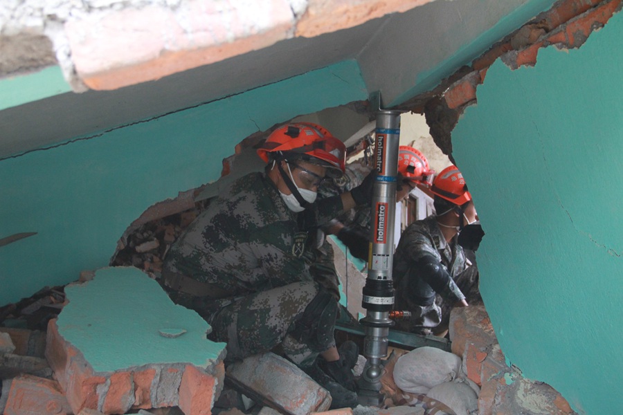 Chinese rescue team fights in Katmandu. (People's Daily/Lyu Pengfei)