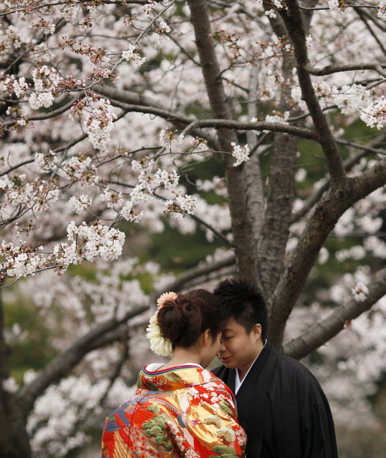 A couple takes wedding photos under cherry trees in Yokohama, Japan on March 29, 2015. (Xinhua/AP)