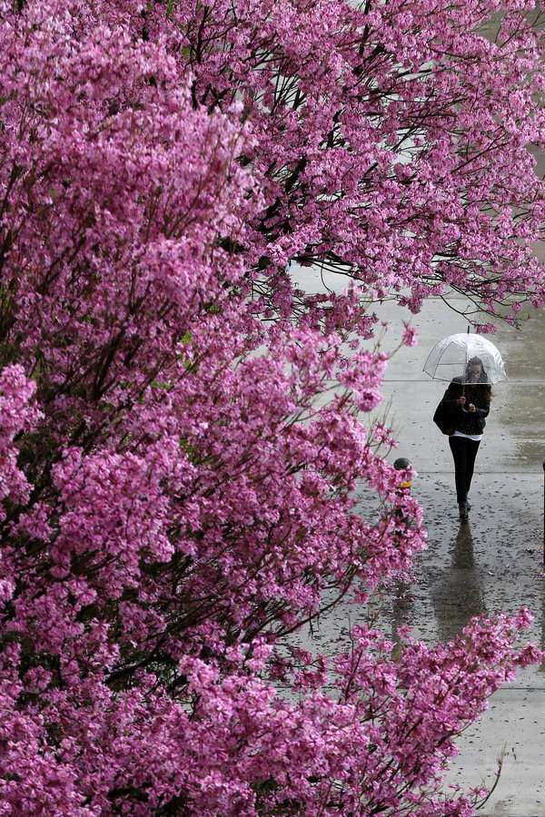 A woman walks in rains holding an umbrella at University of California in United States on March 2, 2015. (Xinhua/AP)