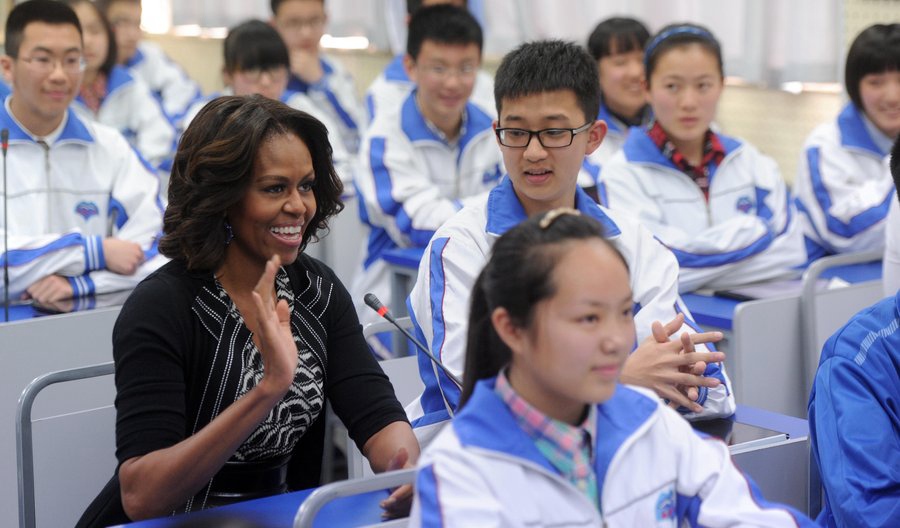 Michelle Obama communicates with students from Wenjiang No. 2 Middle School at Chengdu No.7 Middle School via distance education system on the morning of March 25, 2014. (Photo/Chinadaily.com.cn)