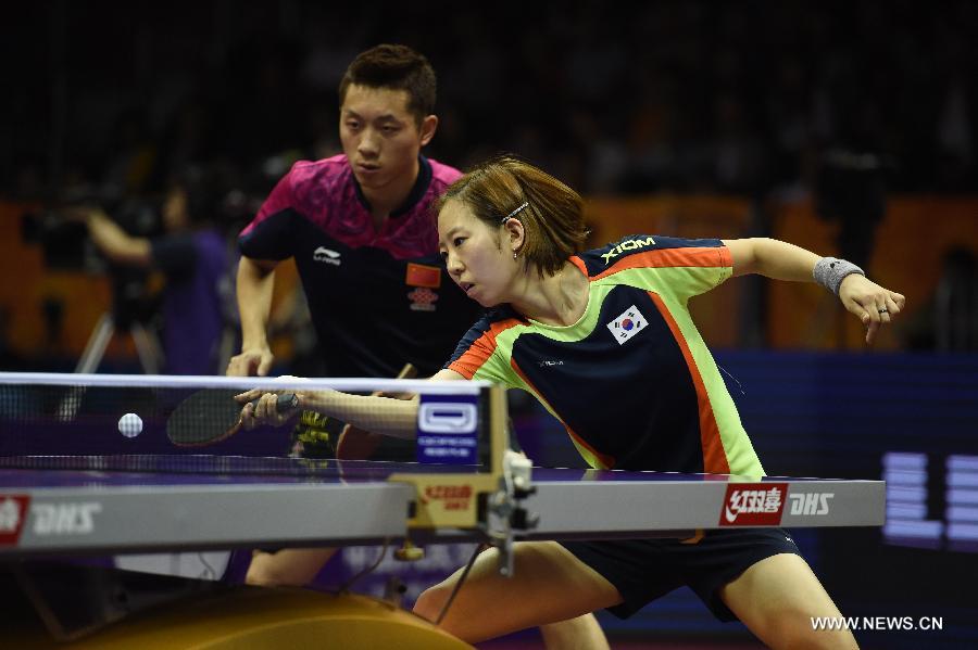 China's Xu Xin(L)/South Korea's Yang Haeun compete during the Mixed Doubles match against Hong Kong China's Wong Chun Ting/Doo Hoi Kem at the 53rd Table Tennis World Championships in Suzhou, city of east China's Jiangsu Province, on April 30, 2015. Xu Xin/Yang Haeun won the match 4-1. (Xinhua/Song Zhenping)