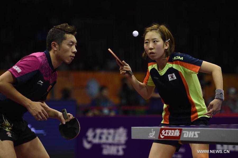 China's Xu Xin(L)/South Korea's Yang Haeun serve the ball during the Mixed Doubles match against Hong Kong China's Wong Chun Ting/Doo Hoi Kem at the 53rd Table Tennis World Championships in Suzhou, city of east China's Jiangsu Province, on April 30, 2015. Xu Xin/Yang Haeun won the match 4-1. (Xinhua/Song Zhenping)