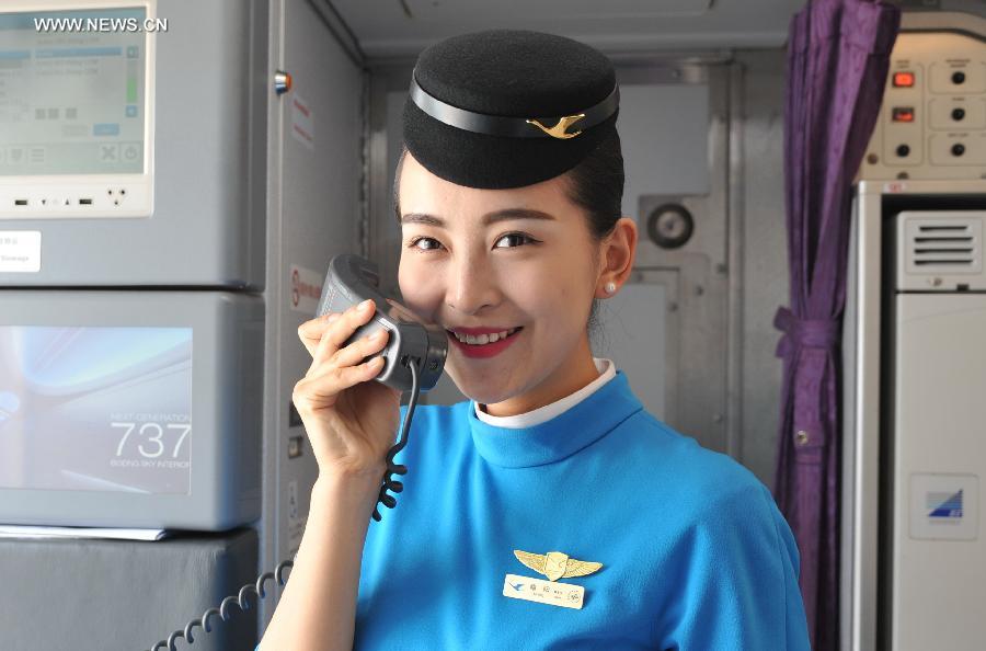 A stewardess of Xiamen Airlines works in a cabin of a passenger airplane on April 30, 2015. Founded in 1984, China's Xiamen Airlines has for the last 30 years rapidly developed its international business and established itself as a top class airline in Asia for its excellent service and strong financial performance. (Xinhua/Lin Shanchuan)