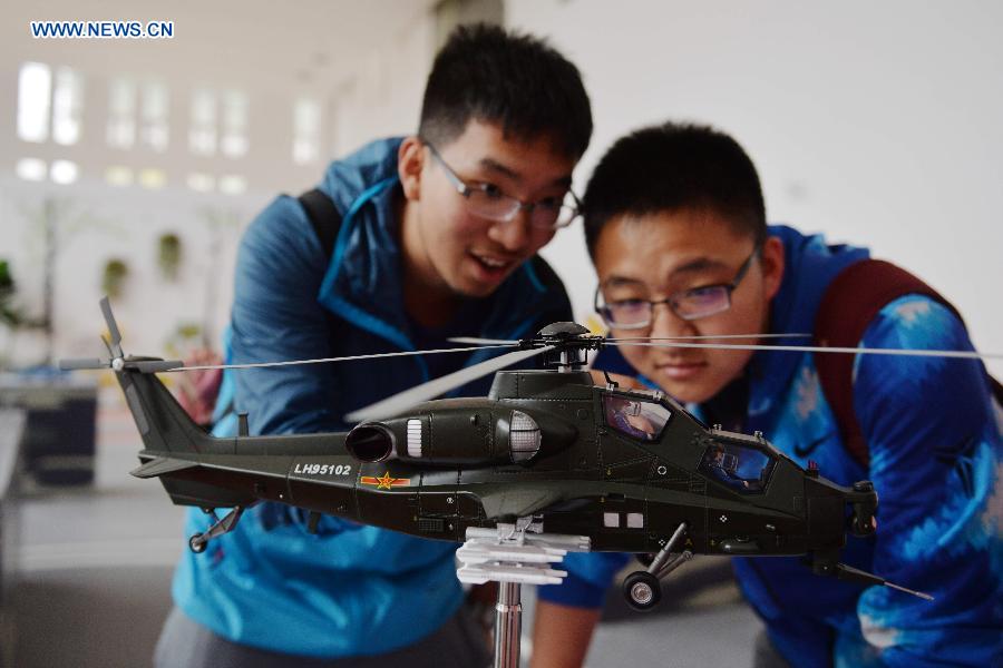 People view a model of military helicopter during the 2015 northwest defense and weapon industry exhibition in Lanzhou, capital of northwest China's Gansu Province, April 30, 2015. The exhibition will last until May 17. (Xinhua/Chen Bin)