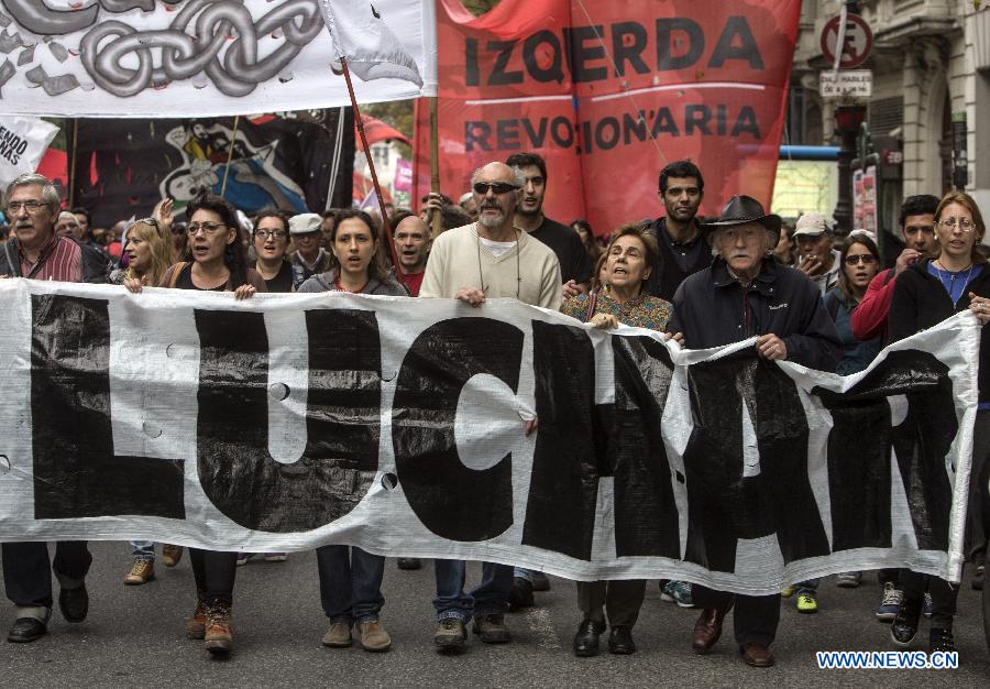 Members of left wing parties, social organizations and students take part in the march in Buenos Aires city, capital of Argentina, on May 1, 2015, the International Workers' Day. (Xinhua/Martin Zabala)