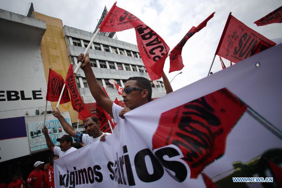 Demonstrators hold flags during a march organized by United Union of Workers and the Confederation of Chilean Students in Santiago, capital of Chile, on May 1, 2015, the International Workers' Day. (Xinhua/Jorge Villegas)