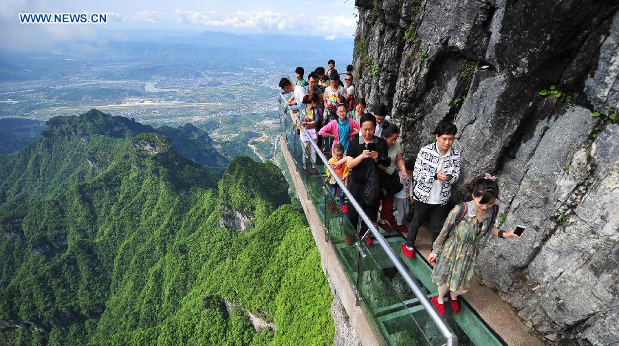 Tourists walk on a pavement built with glass on the cliff at the national forest park in Tianmen Mountain in Zhangjiajie, central China's Hunan Province, May 2, 2015. Many tourists come to experience the glass pavement built on the cliff of Tianmen Mountain with an altitude of about 1,430 meters during the May Day holiday. (Xinhua/Shao Ying)