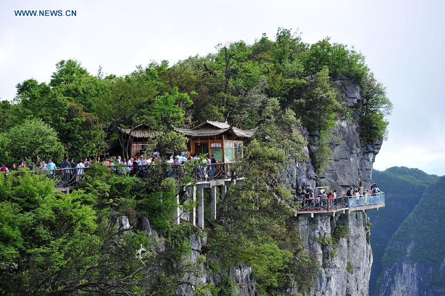 | Tourists walk on a pavement built with glass on the cliff at the national forest park in Tianmen Mountain in Zhangjiajie, central China's Hunan Province, May 2, 2015. Many tourists come to experience the glass pavement built on the cliff of Tianmen Mountain with an altitude of about 1,430 meters during the May Day holiday. (Xinhua/Shao Ying) |