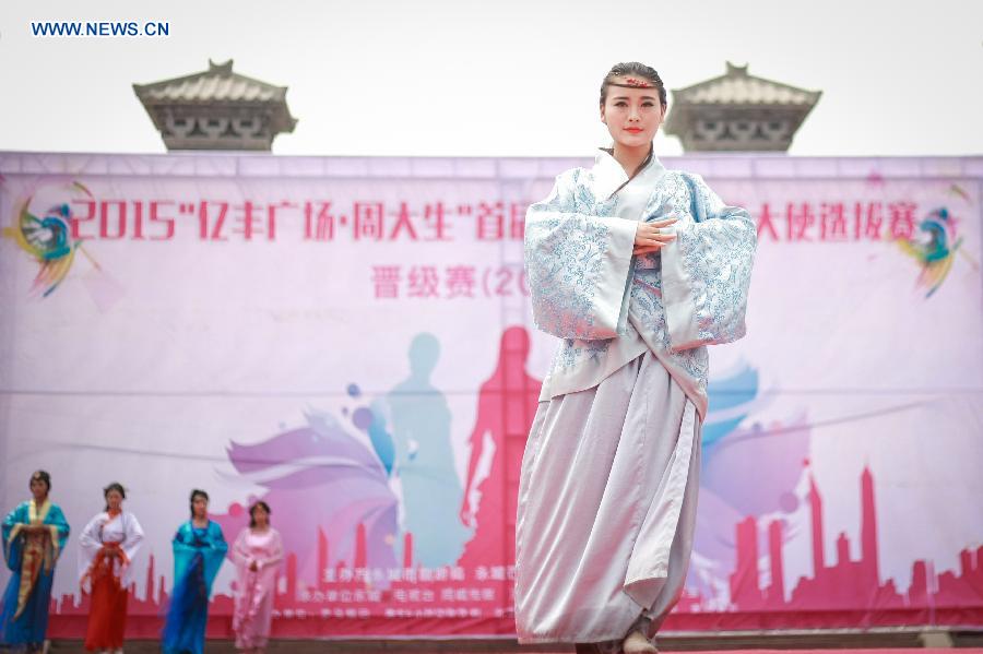 A model displays the Hanfu, or Han dress, in Mang Dang Mountain Han Culture Tourism Area in Yongcheng City of central China's Henan Province, May 2, 2015. Hanfu is the traditional dress of the Han Chinese people. (Xinhua/Zheng Huansong)