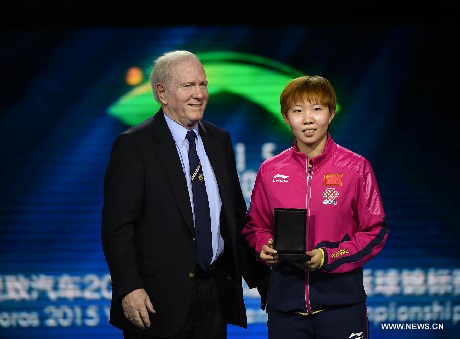 China's Zhu Yuling (R) takes the Fair Play Award during the awarding ceremony at the 53rd Table Tennis World Championships in Suzhou, city of east China's Jiangsu Province, on May 3, 2015. (Xinhua/Li Xiang)