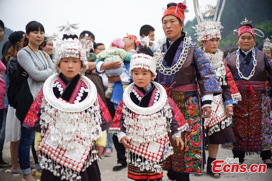 People of Miao ethnic group dressed in traditional costumes celebrate the Miao Sisters Festival in Taijiang county, southwest China’s Guizhou province, May 3, 2015. The Miao Sisters Festival, regarded as Miao's folk Valentine's Day, is held annually around the 15th day of the third lunar month according to the Miao calendar. (Photo: China News Service/He Junyi)