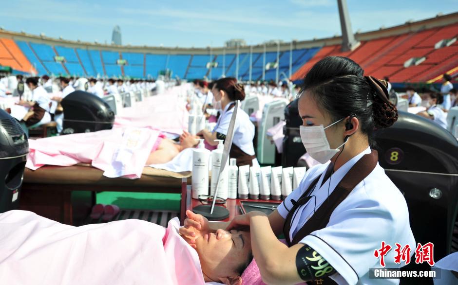 A total of 1,000 women in pink bathrobes receive free beauty treatment at a soccer field in Jinan, capital of east China's Shandong province, May 4, 2015. 1,000 beauticians offered the facial treatments at the same time; successfully set a new Guinness World Record. (CNS/Zhang Yong)