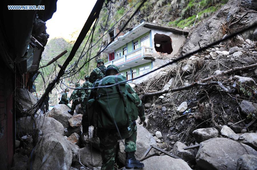 Soldiers of the traffic rescue brigade of China's Armed Police Force pass by damaged buildings in Sindhupalchowk, Nepal, on May 4, 2015. China's armed police officers of traffic rescue left southwestern Tibet Autonomous Region and entered Nepal for the first time on Sunday to aid earthquake relief there. (Xinhua/Wen Tao)