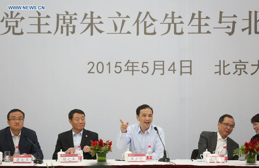 Chinese Kuomintang (KMT) Chairman Eric Chu (3rd L) attends a discussion with students and teachers of Peking University (PKU) in Beijing, capital of China, May 4, 2015. (Xinhua/Wang Shen)