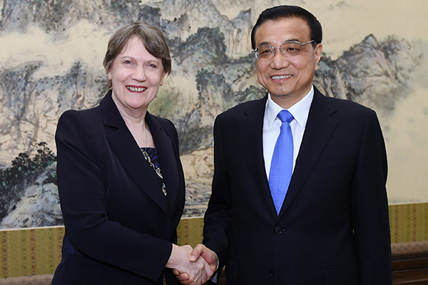 Helen Clark, also the UNDP administrator, met with Chinese Premier Li Keqiang and commerce, economic planning and foreign ministry officials in Beijing on Monday.